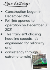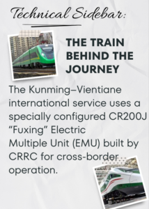 The train itself was striking: green with red, blue, and black stripes, a livery created specifically for the China–Laos international service. This wasn’t just another train; it felt like a rolling symbol of connectivity. The Kunming–Vientiane international service uses a specially configured CR200J “Fuxing” Electric Multiple Unit (EMU) built by CRRC for cross-border operation.